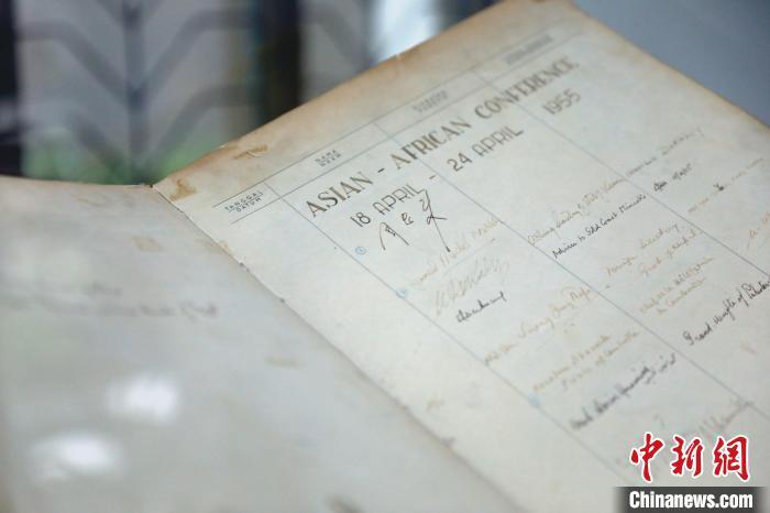 圖為薩沃爾·霍曼飯店內(nèi)玻璃展柜中陳列著一本珍貴的紀(jì)念簿,上面印有萬隆會議召開時(shí)間等信息?!≈行律缬浾?李志全 攝