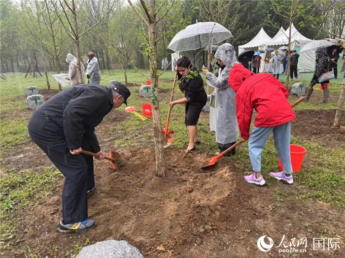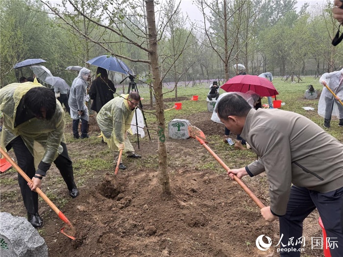圖為玻利維亞駐華使館的使節(jié)在種植樹苗。人民網(wǎng)記者 彭敏攝