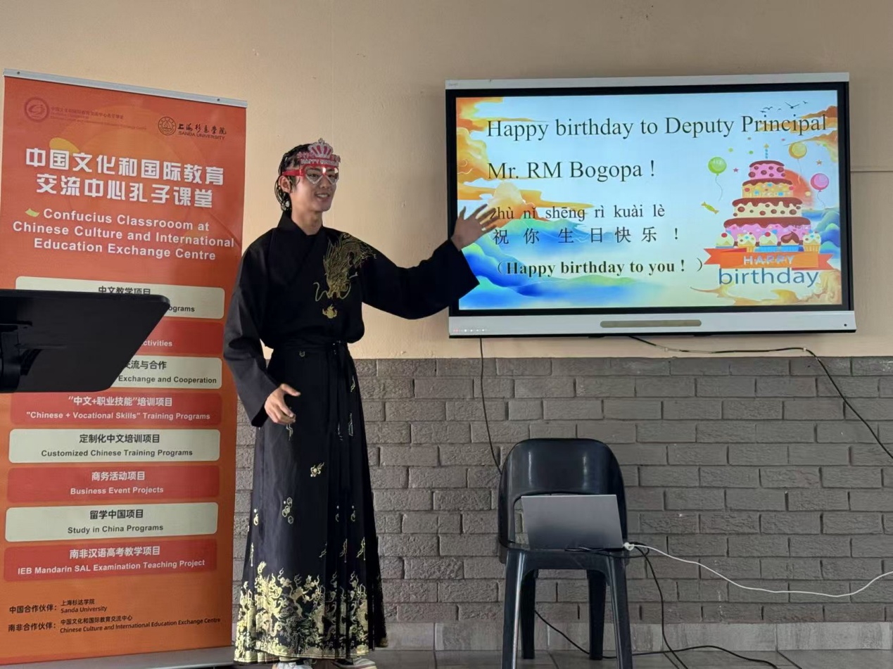 志愿者王清超帶領(lǐng)南非學(xué)生們齊唱中文版《生日快樂》歌??鬃诱n堂供圖