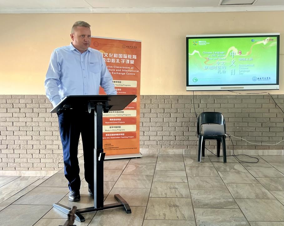 活動(dòng)伊始,卡特洪工程??茖W(xué)校校長歐普曼先生致辭歡迎。他深情回顧了2024年參與“漢語橋”南非校長訪華團(tuán)的經(jīng)歷,分享了對(duì)中華文化的贊嘆和對(duì)中文教育的高度肯定。他表示,中文不僅是一種溝通工具,更是一把開啟未來之門的鑰匙,將為南非學(xué)子鋪就通向世界的橋梁。