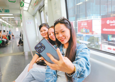 越南當?shù)孛癖娫诤觾燃`—河東線輕軌車廂里自拍。人民日報海外版記者 沈小曉攝