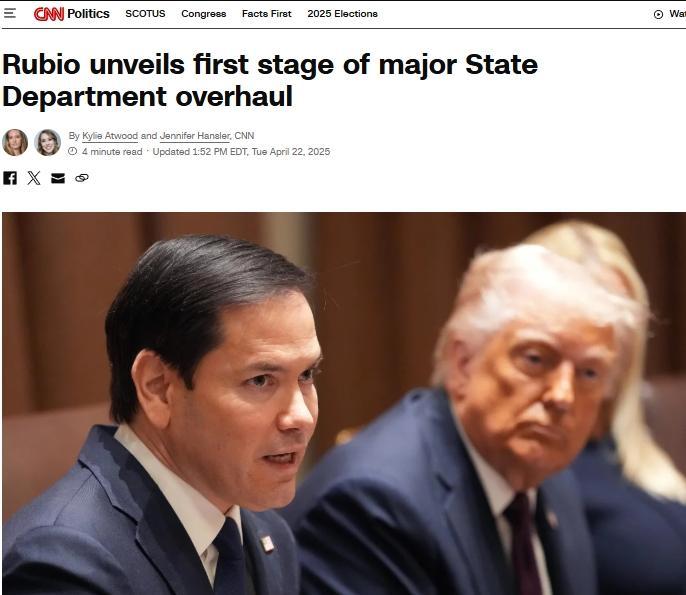 中新網(wǎng)4月23日電 綜合美媒報道,當(dāng)?shù)貢r間22日,美國國務(wù)卿魯比奧宣布,美國務(wù)院將實(shí)施全面重組計劃,落實(shí)美國總統(tǒng)特朗普宣揚(yáng)的“美國優(yōu)先”外交政策。