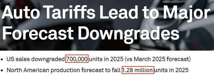 根據(jù)標普全球最新報告,如果美國持續(xù)對進口汽車加征高額關稅,今年美國汽車銷量將減少約70萬輛,北美地區(qū)的汽車產量將減少128萬輛。