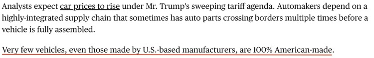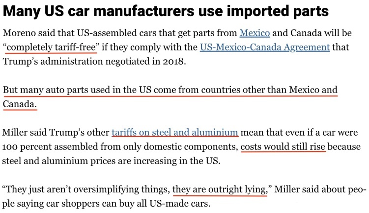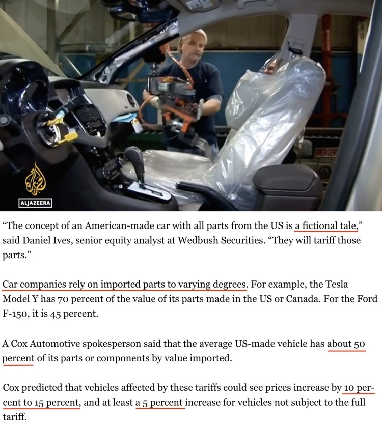 由于汽車制造商依賴高度整合的全球供應鏈,汽車零部件在整車組裝完成之前需要經過多次跨境運輸,“即使是由美國制造商生產的汽車也難有真正的100%美國制造”。