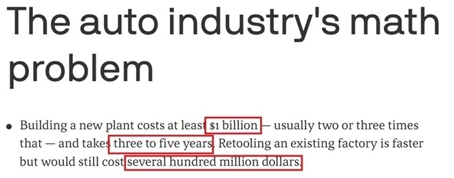 有美媒報道稱,在美國新建一家汽車工廠的成本往往在10億至30億美元之間,而且需要三到五年時間。依托已有工廠改造生產線雖然會相對快些,但仍需要花費數(shù)億美元。