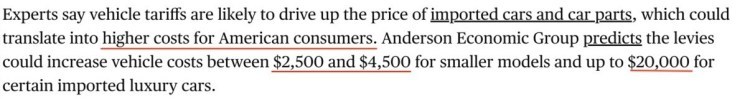 據(jù)美國安德森經濟集團估算,關稅可能會使每輛小型汽車價格平均增加2500至4500美元,某些進口豪華車的單價可能會最多增加2萬美元。