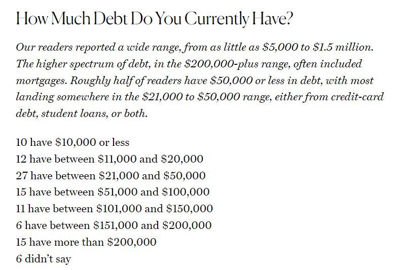 該網(wǎng)站針對(duì)102名讀者就個(gè)人債務(wù)問(wèn)題進(jìn)行了調(diào)查,了解他們?nèi)绾伪池?fù)和償還債務(wù)。調(diào)查發(fā)現(xiàn),個(gè)人債務(wù)總額從5000美元到150萬(wàn)美元不等,20萬(wàn)美元以上的債務(wù)通常包含抵押貸款。約半數(shù)受訪者的債務(wù)在5萬(wàn)美元及以下,最常見(jiàn)的債務(wù)范圍在2.1萬(wàn)美元至5萬(wàn)美元之間。