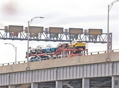 針對(duì)美國新關(guān)稅政策,加拿大對(duì)美國汽車對(duì)等征收25%關(guān)稅措施已于日前生效。圖為近日,在加拿大安大略省尼亞加拉瀑布市加美邊境地帶,一輛滿載的汽車運(yùn)輸車通過劉易斯頓—昆斯頓橋開往加拿大。鄒 崢攝(新華社發(fā))