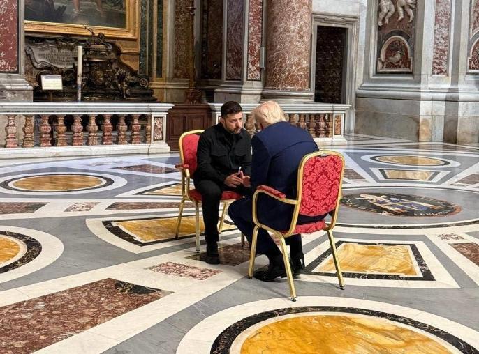 根據(jù)英國天空新聞網(wǎng)此前發(fā)布的現(xiàn)場(chǎng)照片,澤連斯基和特朗普坐在教堂內(nèi),進(jìn)行了面對(duì)面交談。