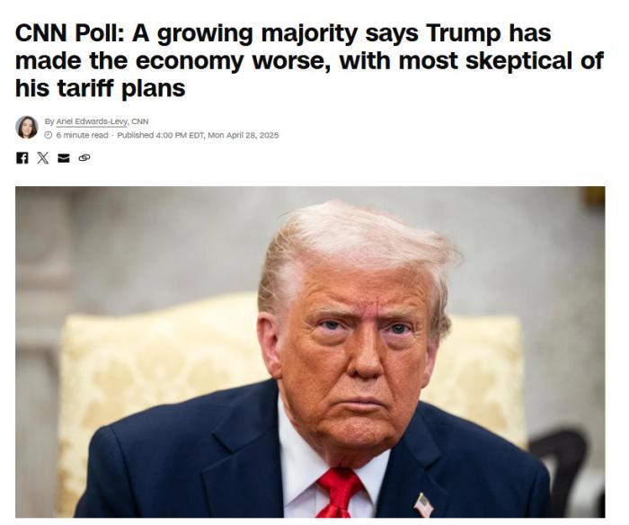 中新網(wǎng)4月29日電 據(jù)美國有線電視新聞網(wǎng)(CNN)當?shù)貢r間28日報道,CNN委托民調(diào)機構(gòu)進行的一項最新民調(diào)顯示,目前59%的民眾認為特朗普政府的政策惡化了美國經(jīng)濟狀況,這一比例較3月份的51%有所上升。