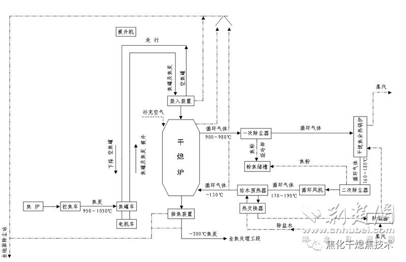 干熄焦,相對濕熄焦而言,是指采用惰性氣體將紅焦降溫冷卻的一種熄焦方法。在干熄焦過程中,紅焦從干熄爐頂部裝入,低溫惰性氣體由循環(huán)風(fēng)機(jī)鼓入干熄爐冷卻段紅焦層內(nèi),吸收紅焦顯熱,冷卻后的焦炭從干熄爐底部排出,從干熄爐環(huán)形煙道出來的高溫惰性氣體流經(jīng)干熄焦鍋爐進(jìn)行熱交換,鍋爐產(chǎn)生蒸汽,冷卻后的惰性氣體由循環(huán)風(fēng)機(jī)重新鼓入干熄爐,惰性氣體在封閉的系統(tǒng)內(nèi)循環(huán)使用。該技術(shù)可節(jié)約用水、減少大氣污染物排放,回收大量紅焦顯熱并產(chǎn)生中高壓蒸汽,有效提高能源利用效率及焦炭質(zhì)量,擴(kuò)大煉焦煤適應(yīng)性,降低煉鐵工序能耗,最終實(shí)現(xiàn)企業(yè)的節(jié)能減排。