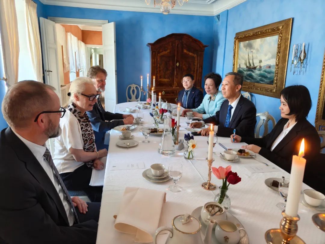 中國駐瑞典大使崔愛民會(huì)見瑞典哥特蘭省省督戈?duì)柲岽目ǖ裙賳T。中國駐瑞典大使館供圖