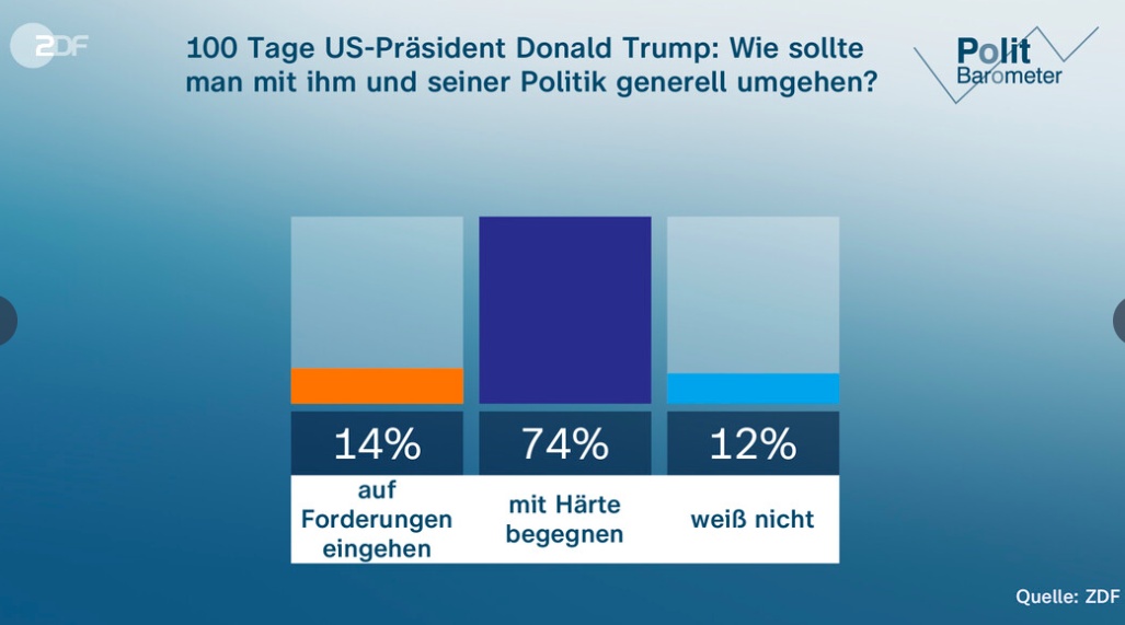 根據(jù)這項調(diào)查,大多數(shù)受訪者認(rèn)為德國經(jīng)濟(jì)正在走下坡路,幾乎沒有人對近期經(jīng)濟(jì)復(fù)蘇抱有希望,而美國總統(tǒng)特朗普采取的加征關(guān)稅等措施更是進(jìn)一步加劇了德國經(jīng)濟(jì)壓力。在此背景下,74%的受訪者明確表示,德國政府在對美政策上應(yīng)“更加強(qiáng)硬”,只有14%的人認(rèn)為應(yīng)對美作出妥協(xié)。