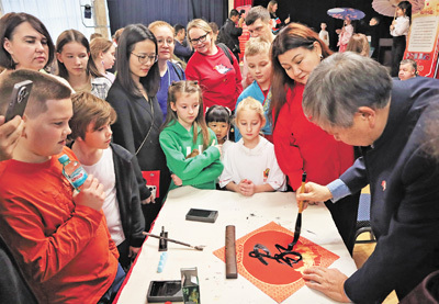 2月,俄羅斯中小學師生在莫斯科觀看中國書法展示。