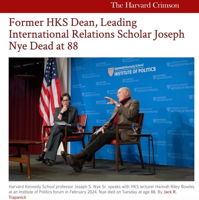 哈佛大學(xué)前校長勞倫斯·薩默斯在社交媒體平臺上發(fā)表悼念約瑟夫·奈的貼文,稱贊其是一位“淵博的學(xué)者”和“敬業(yè)的公職人員”。