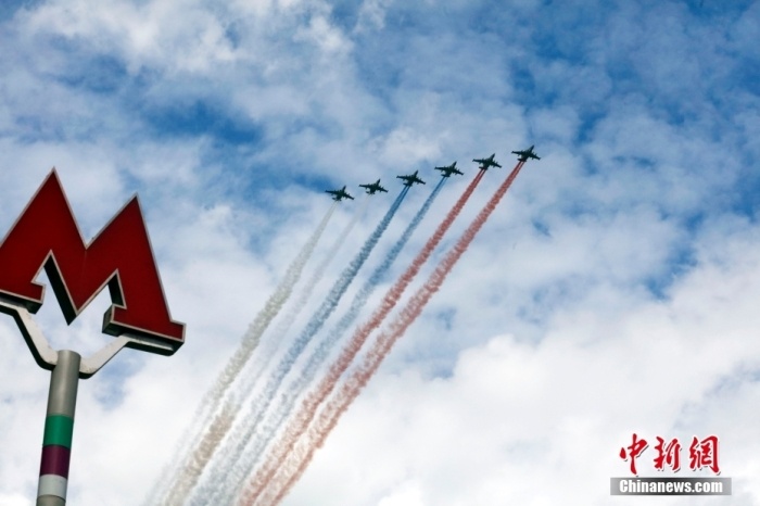 資料圖:當(dāng)?shù)貢r(shí)間5月7日,紀(jì)念蘇聯(lián)偉大衛(wèi)國(guó)戰(zhàn)爭(zhēng)勝利80周年閱兵式總彩排在俄羅斯首都莫斯科舉行,這也是5月9日紅場(chǎng)閱兵式前的最后一次彩排。圖為戰(zhàn)機(jī)編隊(duì)飛過(guò)莫斯科上空。中新社記者 田冰 攝
