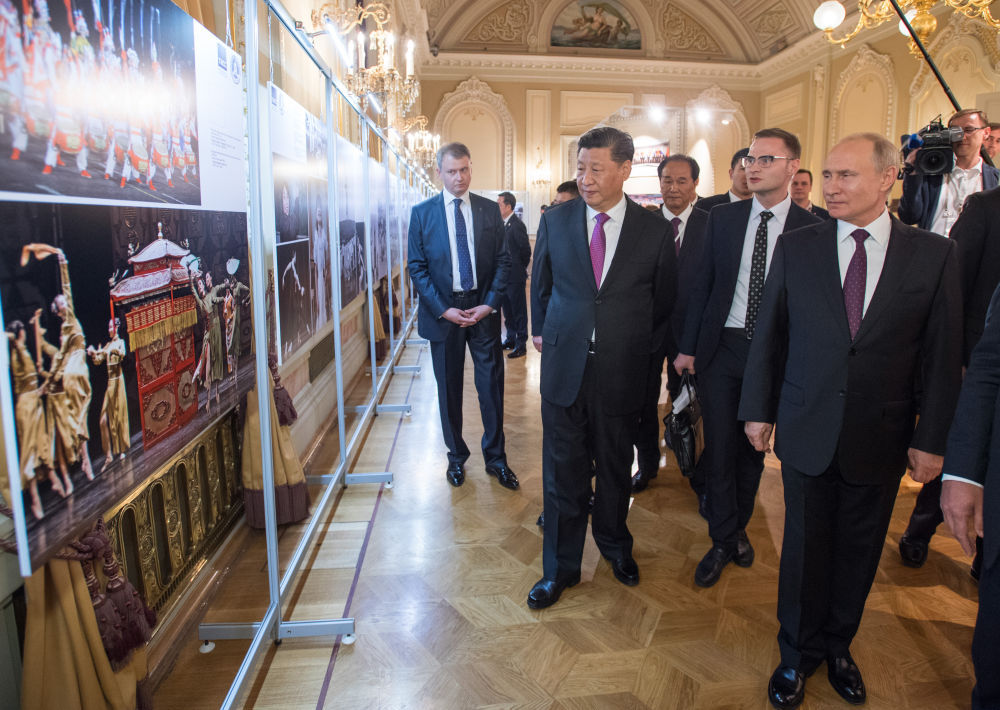 2019年6月5日,國家主席習近平和俄羅斯總統普京在莫斯科大劇院共同出席中俄建交70周年紀念活動。這是兩國元首共同參觀中俄建交70周年圖片展。