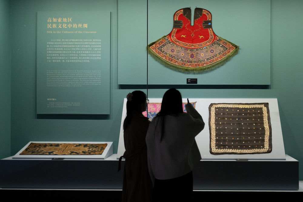 2024年11月22日,由湖北省博物館、俄羅斯民族博物館主辦的“傳統之繭:歐亞大陸民族文化中的絲綢——俄羅斯民族博物館藏文物展”在湖北省博物館開幕。這是參觀者在欣賞展品。