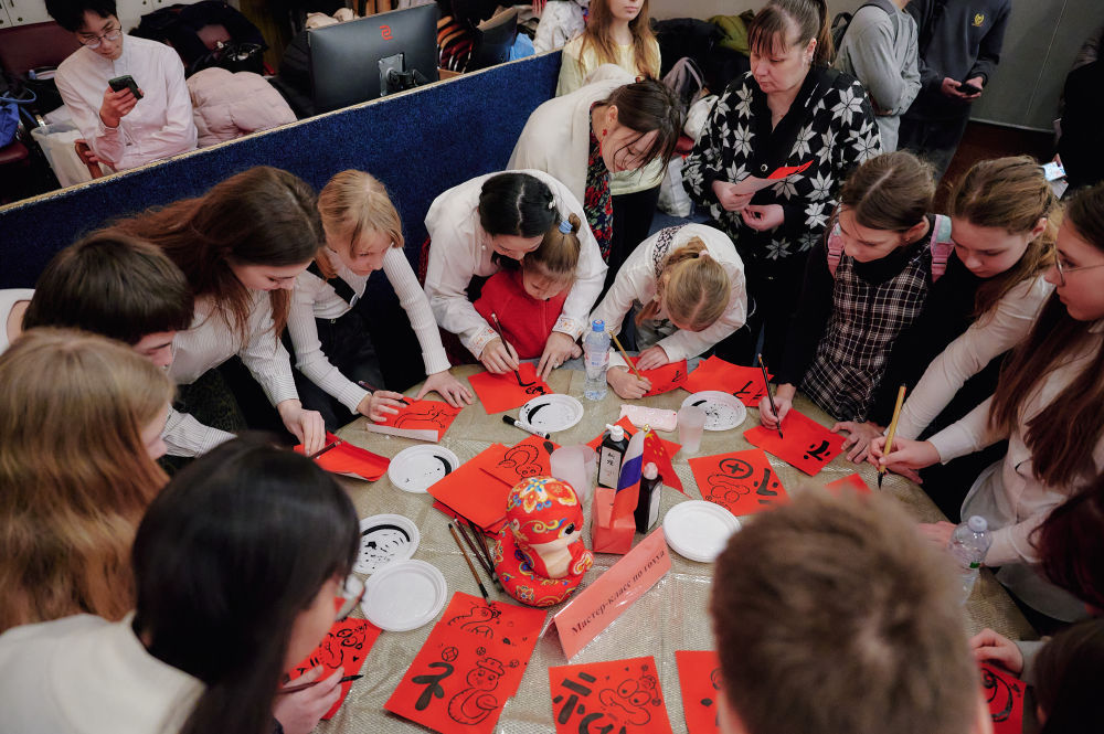 2025年2月3日,俄羅斯圣彼得堡學生在中小學春節(jié)聯歡節(jié)上體驗中國書法。