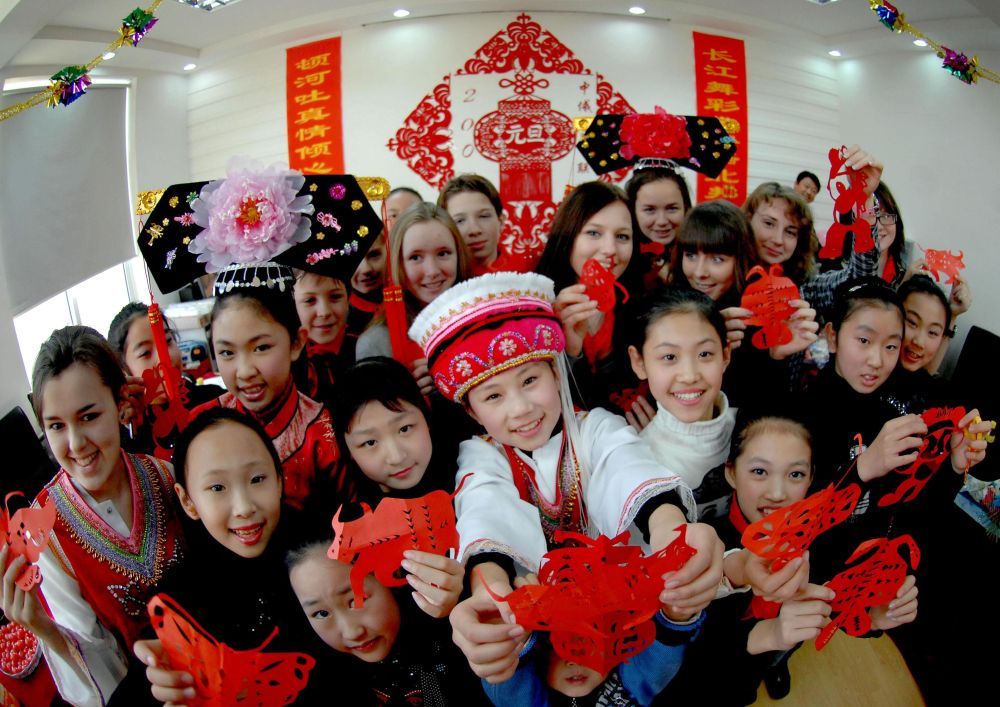 2008年12月30日,中俄學生在沈陽“莫斯科學生體驗中國冬令營”活動上展示自己的剪紙作品。