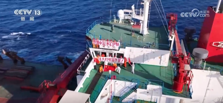 經(jīng)過2個多晝夜、580余海里的航行,護(hù)航編隊安全抵達(dá)亞丁灣東部某海域解護(hù)點。分航之際,“振華35”號船員在船舷一側(cè)展開“偉大的祖國萬歲”“感謝中國海軍護(hù)航”橫幅,揮舞五星紅旗,向祖國軍艦表達(dá)感激之情。