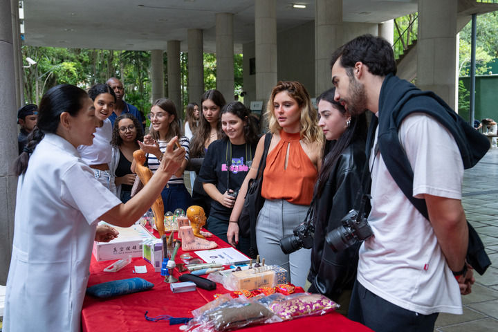 2025年4月15日,在巴西里約熱內(nèi)盧天主教大學(xué)舉辦的“國(guó)際中文日”慶祝活動(dòng)上,學(xué)生們觀看中醫(yī)療法展示。新華社記者 王天聰 攝