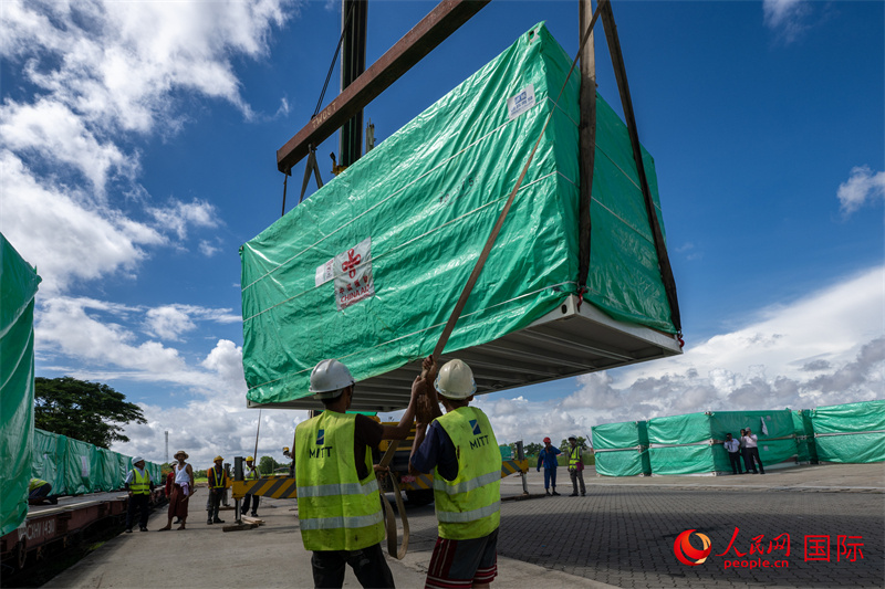 5月14日,當(dāng)?shù)毓と嗽诟劭趶呢涊喩闲遁d援緬第十四批緊急人道主義地震救災(zāi)物資。人民網(wǎng)記者 謝佳君攝
