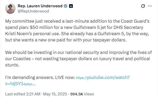 安德伍德說,“上周五,當我們在最后一刻得知您在25(財年)開支計劃中增加的新內(nèi)容時,我非常震驚:在海岸警衛(wèi)隊的預(yù)算中新增一架價值5000萬美元的灣流五型飛機,用于諾姆部長的私人旅行?!?/p>