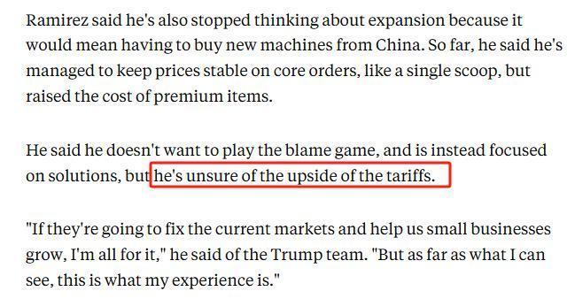 一家墨西哥風(fēng)味甜品店店主則表示,通常自己所有“不易腐爛”的原材料都來自中國。145%的關(guān)稅讓他轉(zhuǎn)向了美國本土供應(yīng)商,但后者的價(jià)格更貴,且提供的是非定制產(chǎn)品。他告訴《商業(yè)內(nèi)幕》,自己已經(jīng)暫停了開新店的計(jì)劃,因?yàn)檫@意味著需要從中國進(jìn)口新的機(jī)器和原材料。自己目前只能保證核心單品不漲價(jià),但已提高了精品產(chǎn)品的價(jià)格。