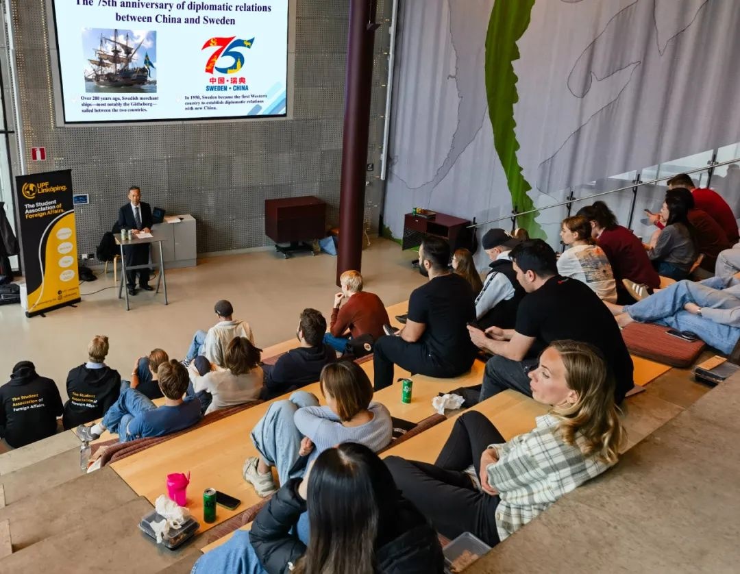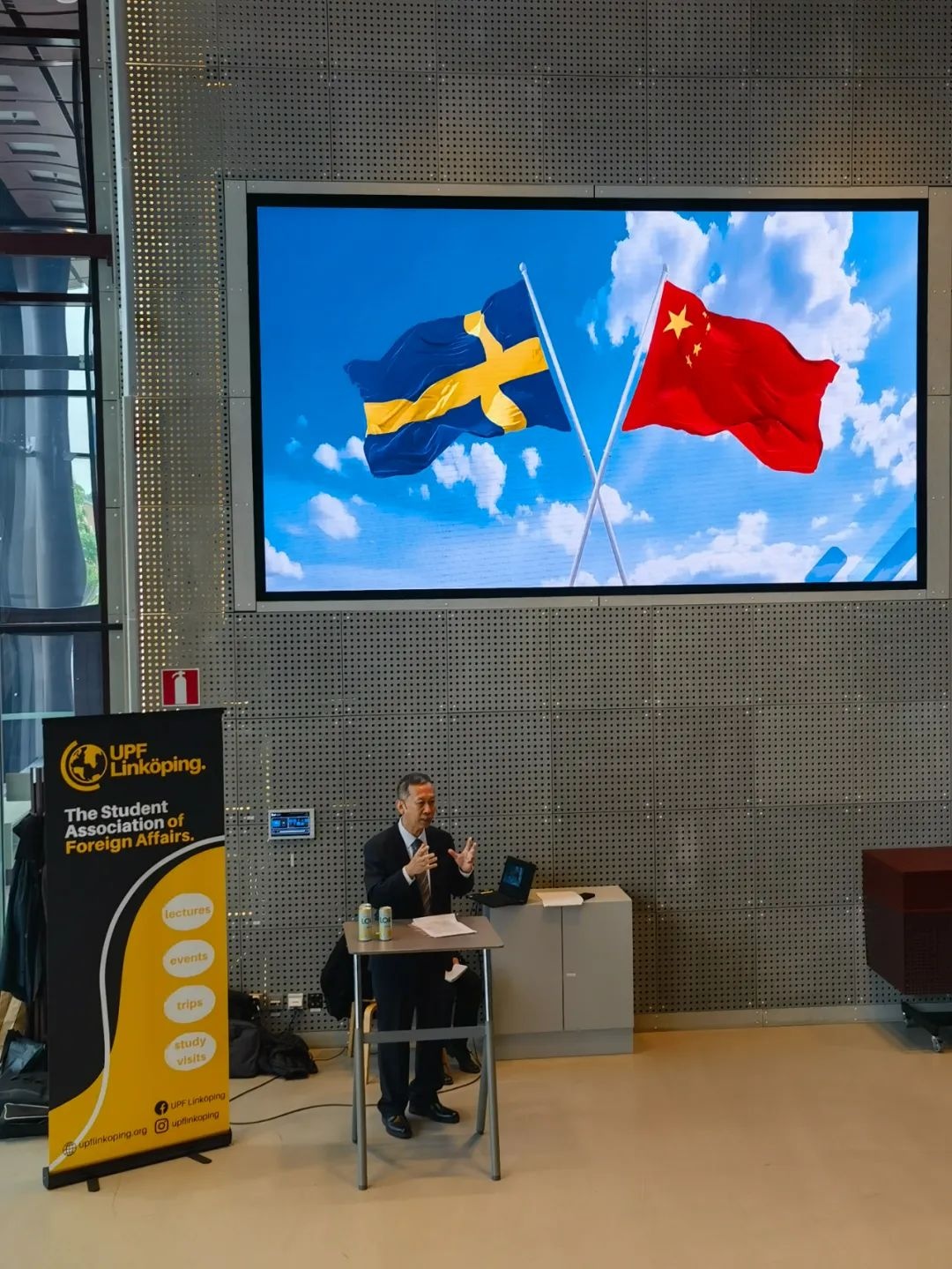 中國(guó)駐瑞典大使崔愛民在林雪平大學(xué)發(fā)表演講。中國(guó)駐瑞典大使館供圖