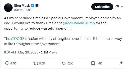 中新網(wǎng)5月29日電 據(jù)外媒報(bào)道,當(dāng)?shù)貢r(shí)間28日,美國(guó)“政府效率部”負(fù)責(zé)人馬斯克在社交媒體X上發(fā)文表示,他作為“特殊政府雇員”的任期即將結(jié)束。