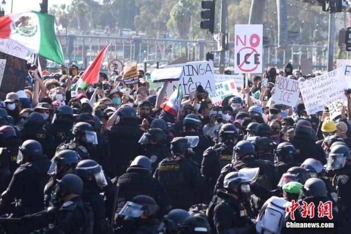 當(dāng)?shù)貢r(shí)間6月8日,美國加利福尼亞州洛杉磯市中心爆發(fā)反搜捕非法移民行動(dòng)抗議示威,抗議者與警方發(fā)生沖突。連日來,美國移民與海關(guān)執(zhí)法局等聯(lián)邦機(jī)構(gòu)在洛杉磯郡多地搜捕非法移民,與抗議者爆發(fā)嚴(yán)重沖突。中新社記者 張朔 攝