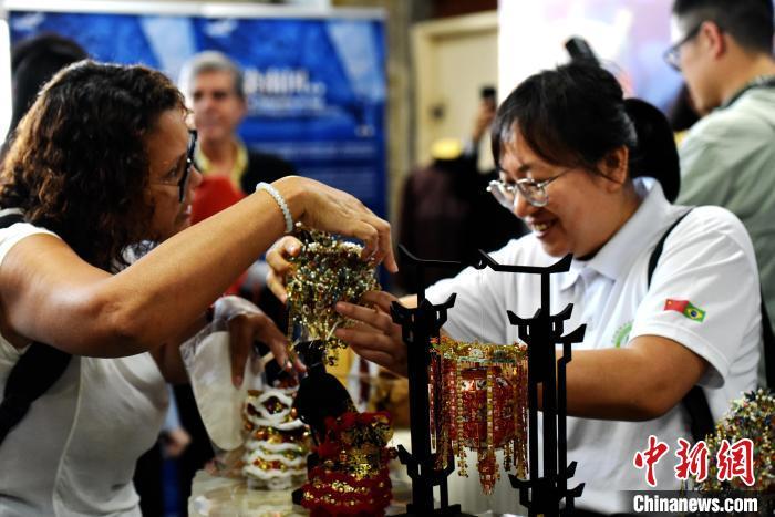 當(dāng)?shù)貢r間6月27日,文明對話系列活動(金磚專場)在巴西里約熱內(nèi)盧舉行。一位巴西觀眾在“歡朋滿粵”嶺南文化創(chuàng)新展上了解國潮鳳冠。中新社記者 林春茵 攝