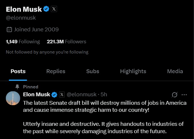 當(dāng)?shù)貢r(shí)間6月28日,美國(guó)企業(yè)家埃隆·馬斯克在社交媒體平臺(tái)上發(fā)文表示,美國(guó)參議院關(guān)于大規(guī)模稅收與支出法案的最新草案“將摧毀美國(guó)數(shù)百萬(wàn)個(gè)就業(yè)崗位,并對(duì)美國(guó)造成巨大的戰(zhàn)略傷害”。馬斯克還說(shuō):“這項(xiàng)法案將債務(wù)上限提高5萬(wàn)億美元,這是歷史上最大的增幅,讓美國(guó)走上被債務(wù)奴役的快車(chē)道?!?/p>
