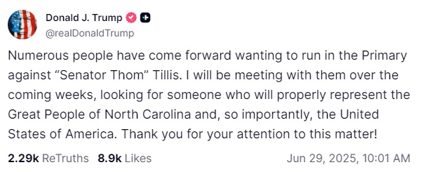 共和黨籍北卡羅來(lái)納州參議員湯姆·蒂利斯投下反對(duì)票后,特朗普在社交媒體發(fā)文威脅道,許多人都想在明年的議員競(jìng)選中與蒂利斯競(jìng)爭(zhēng),他將在未來(lái)幾周與這些人會(huì)面,尋找一位“能夠真正代表北卡羅來(lái)納州人民以及美國(guó)”的人選。