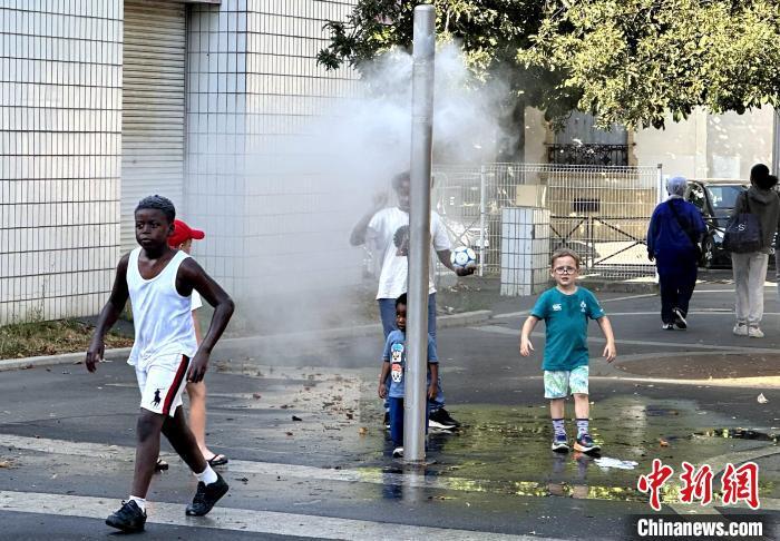 當(dāng)?shù)貢r間7月1日,法國巴黎遭遇高溫紅色警報。圖為一群兒童在巴黎郊外的防暑設(shè)施周圍活動。中新社記者 李洋 攝