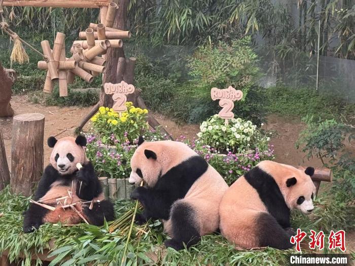 7月7日,在韓國誕生的雌性大熊貓雙胞胎“睿寶”和“輝寶”迎來兩周歲生日。韓國愛寶樂園為它們舉辦慶生活動(dòng)。圖為媽媽“愛寶”(中)與雙胞胎大熊貓?jiān)谏諘?huì)上。中新社記者 劉旭 攝
