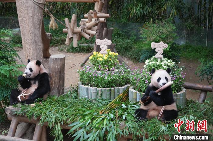 7月7日,在韓國誕生的雌性大熊貓雙胞胎“睿寶”和“輝寶”迎來兩周歲生日。韓國愛寶樂園為它們舉辦慶生活動(dòng)。圖為“睿寶”(左)和“輝寶”(右)在生日會(huì)上。中新社記者 劉旭 攝