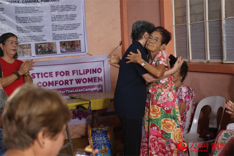 菲律賓華裔青年聯(lián)合會(huì)創(chuàng)會(huì)會(huì)長(zhǎng)洪玉華與馬帕尼克村慰安婦幸存者擁抱。人民網(wǎng)記者 樊帆攝