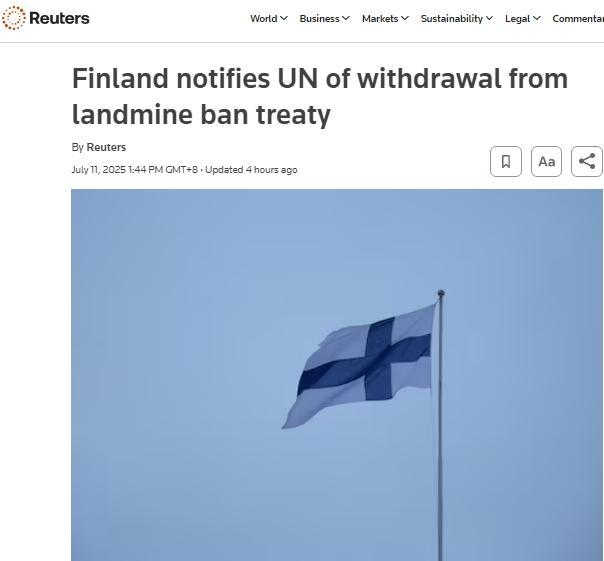 中新網(wǎng)7月11日電 據(jù)路透社報道,當?shù)貢r間10日晚,芬蘭外交部發(fā)表聲明稱,該國已通知聯(lián)合國,將退出《渥太華禁雷公約》。