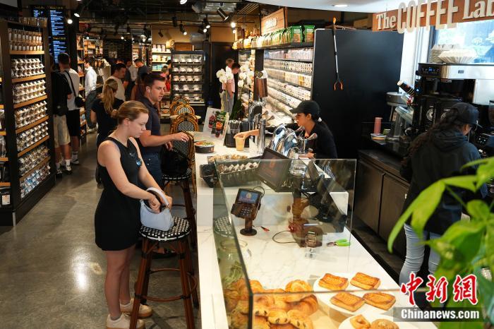 當?shù)貢r間7月15日,美國紐約曼哈頓一家超市顧客購買食物。 中新社記者 廖攀 攝