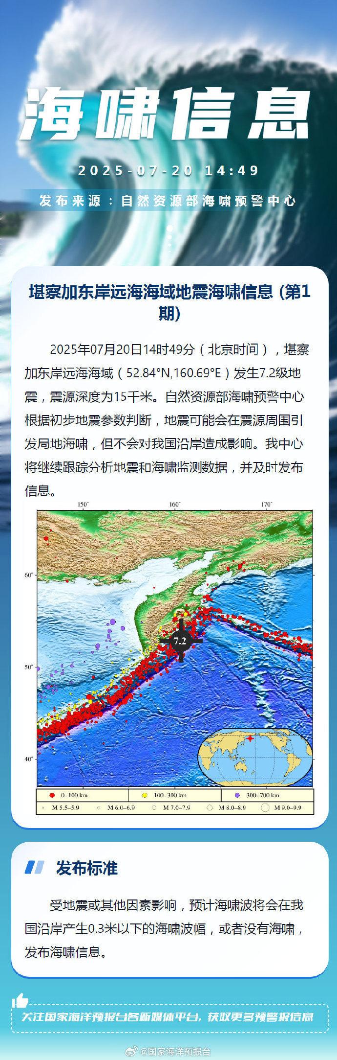 央視網(wǎng)消息:據(jù)國家海洋預(yù)報(bào)臺官方微博信息,2025年07月20日14時(shí)49分(北京時(shí)間),堪察加?xùn)|岸遠(yuǎn)海海域(52.84°N,160.69°E)發(fā)生7.2級地震,震源深度為15千米。自然資源部海嘯預(yù)警中心根據(jù)初步地震參數(shù)判斷,地震可能會在震源周圍引發(fā)局地海嘯,但不會對我國沿岸造成影響。中心將繼續(xù)跟蹤分析地震和海嘯監(jiān)測數(shù)據(jù),并及時(shí)發(fā)布信息。