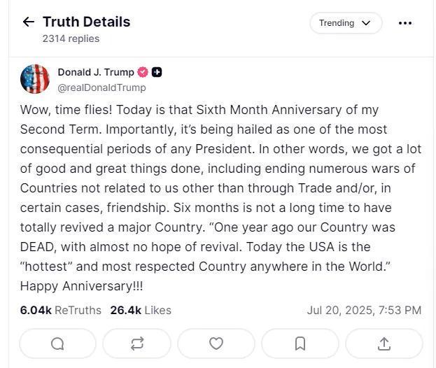 “哇,時(shí)間飛逝!今天是我第二個(gè)任期的半周年紀(jì)念日。”特朗普寫道,“重要的是,這段時(shí)間被認(rèn)為是歷任總統(tǒng)任期內(nèi)最具影響力的時(shí)期之一。換句話說,我們做了很多好事和大事,結(jié)束了多場(chǎng)與我們無關(guān)的國家的戰(zhàn)爭(zhēng)……”