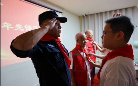 在感人至深的"軍人故事"環(huán)節(jié),69歲的中越邊境自衛(wèi)反擊戰(zhàn)老兵諶章勝、74歲的"東風4號"實驗參與者李文勝與新生代退役軍人胡港同臺分享軍旅經(jīng)歷。諶章勝老人講述戰(zhàn)場上"黨叫我去哪里,我就去哪里"的忠誠堅守;李文勝回憶國防科研中"甘當無名英雄"的奉獻精神;胡港則分享了新時代軍人"消防防控沖鋒在前"的使命擔當。三位英雄跨越時代的紅色敘事,讓在場觀眾無不動容。東湖社區(qū)少先隊員為老英雄獻花、佩戴紅領巾,并齊唱《我們是共產(chǎn)主義接班人》,完成了一場生動的紅色基因傳承。