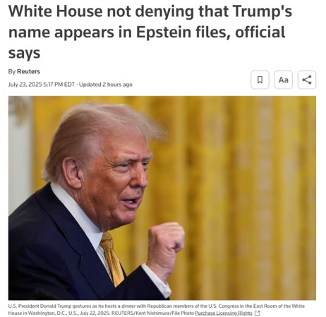 路透社報(bào)道,一名政府官員稱,白宮并未否認(rèn)特朗普總統(tǒng)的名字出現(xiàn)在愛潑斯坦案的相關(guān)文件中