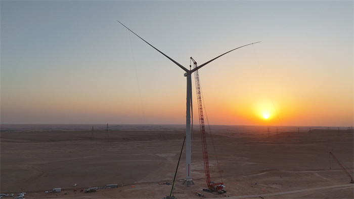 沙特阿爾加特風(fēng)電項目完成首臺風(fēng)機(jī)吊裝。中國電建供圖