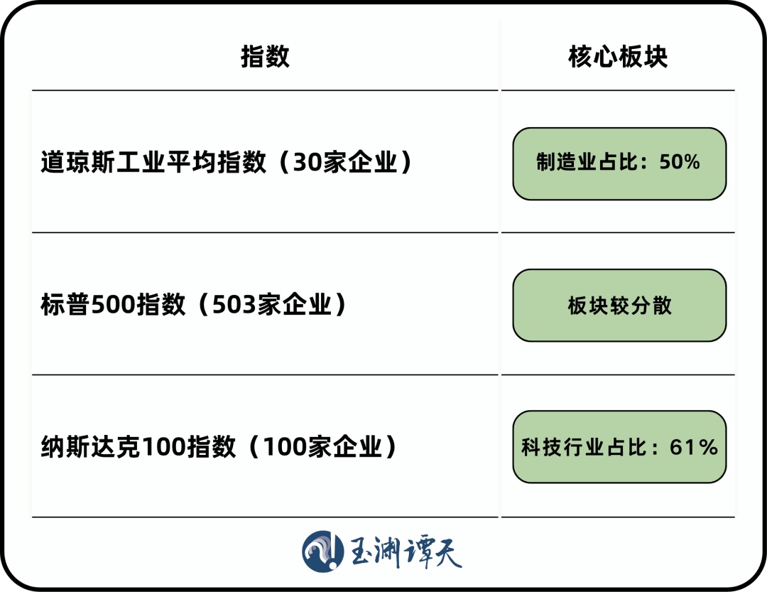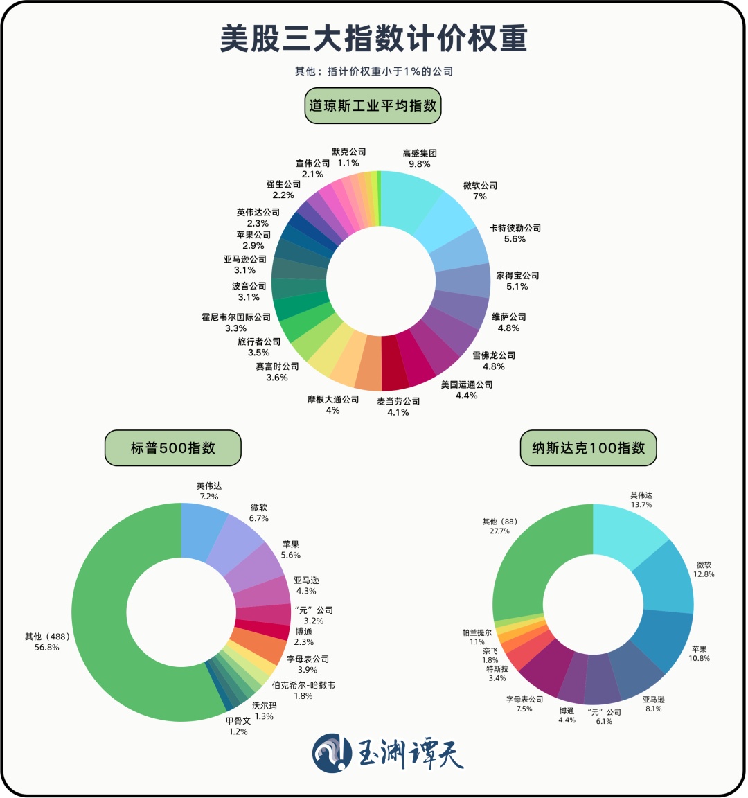 標(biāo)普500和納斯達(dá)克采用“市值加權(quán)”,權(quán)重最大的是那幾個(gè)科技巨頭;而道指用的是“股價(jià)加權(quán)”,高價(jià)股走強(qiáng),也能拉動(dòng)整體指數(shù)。
