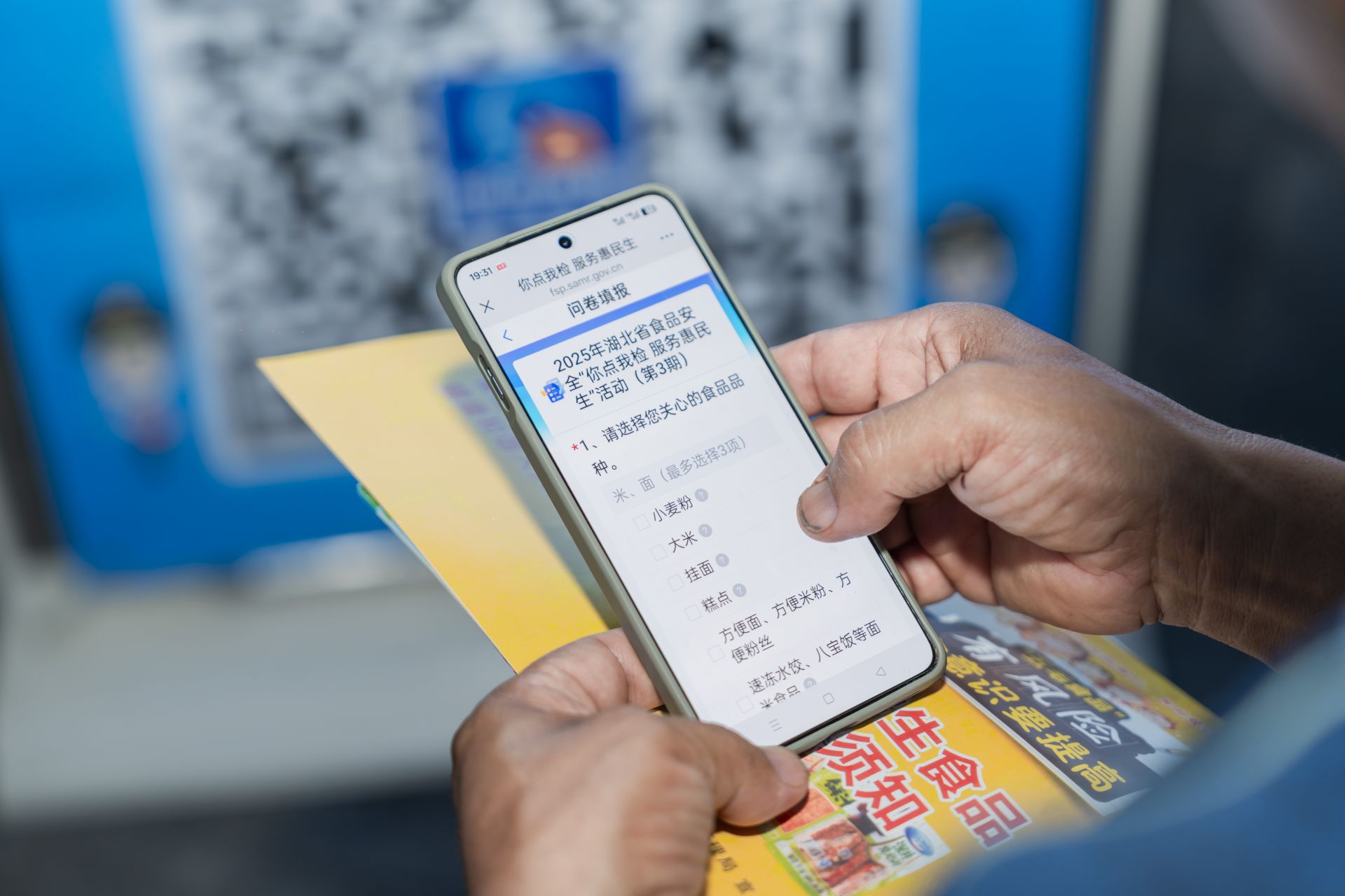 “大叔,您用手機掃一掃這個二維碼,就可以參與點選?!痹诨顒蝇F(xiàn)場,市場監(jiān)管工作人員向來往群眾發(fā)放調(diào)查問卷及食品安全科普資料,并邀請消費者通過掃碼進入“你點我檢 服務(wù)惠民生”民意征集系統(tǒng),勾選自己關(guān)心的食品種類、經(jīng)營場所、檢測項目?!跋奶焯鞖鉄幔紣埸c外賣,希望你們多檢測一下”。在問卷征集過程中,不少消費者提出比較關(guān)注外賣食品安全。