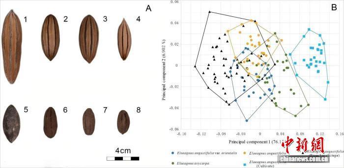 現(xiàn)代栽培、野生沙棗標(biāo)本(左),本次研究一處遺址出土沙棗遺存及其形態(tài)學(xué)分析結(jié)果(右)。陳冠翰 供圖