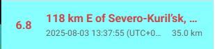 中新網(wǎng)8月3日電 據(jù)美國地質(zhì)調(diào)查局地震信息網(wǎng)消息,俄羅斯千島群島北庫里爾斯克以東118公里處于北京時間3日發(fā)生6.8級地震,震源深度35公里。
